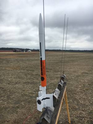 Another rocket picked because its always been a little heavy for standard 18mm C. Quick burn, nice and straight off the rail, arcing over at the top of the climb. Little long on the delay, past apogee and pointed downhill at ejection. Good chute, recovered on the field with no damage.