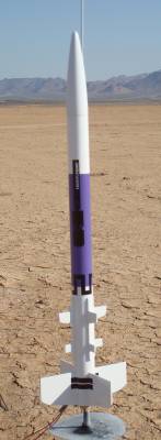 First Flight!  Nice boost, smooth and straight.  Arcing over at the top of the climb, approximately horizontal at ejection.  Good deployment of 12 inch nylon chute.  Minimal drift, caught it on the fly, no damage.