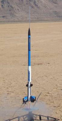 First Flight!  Great boost, straight, high and fast.  Arcing over, still climbing at ejection.  Chute partially inflated due to tangled shock cord.  Faster than normal descent, no drift, caught it on the fly, no damage.