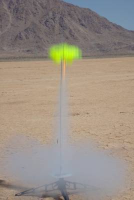 Very nice "Snitch" like flight. Low and sorta slow with lots of smoke and noise. Flipped over at apogee for the typical falling leaf recovery. Two of the wire landing legs were dislodged on impact. Both were recovered and re-installed.