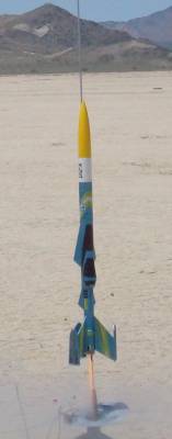 Nice boost, straight, fast and right into the sun.  Didn't see ejection.  Picked it up on the way down under chute.  Lakebed landing, took a small ding on the corner of one fin.