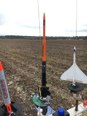 Nice boost, smooth and straight. Arcing over at the top of the climb, past apogee and heading downhill at ejection. Parachute shroud line snagged on the booster section during ejection. Recovered on the field with no damage.