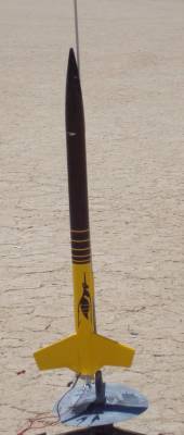Angled the rod into the wind slightly. Nice boost, fast and high. Arcing into the wind, still going up at ejection. Good chute, wind brought it back somewhat close. Lakebed landing. Lip of the BT had a nice dent from the nose cone, guess it really does need a 7 second delay...