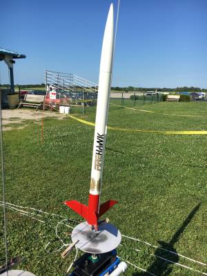 Used all 3 igniters in the pack, but could not light the motor.  Bought a pack of Aertech First Fire Mini igniters which has much more pyrogens on the end.  Had to sand the pyrogens down a bit to get it to fit The nozzle.  Took off with Authoritaaaay!  Great boost, high and straight with a little wiggle under thrust.  Nose up, still climbing at ejection.  Good chute, short walk, grass landing, missing a fin.  Not sure if it came off during boost, are the nose cone came back and hit it.  Missing fin was later found and returned.