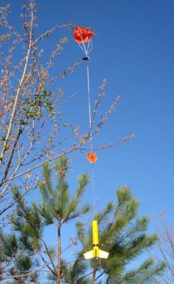 First flight of the day, drag race with Black Shadow for EMRR contest. Nice boost, fast and high, nose up at ejection. Wind took both rockets back into the trees. Goblin recovered w/ no damage.