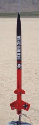 First Flight of the Mini Max / Red Bird kit-bash. Decent boost, straight, but no too high. Stalling out, nose up at ejection. Good chute, got underneath it and missed the catch. Lakebed landing, picked up a few paint dings.
