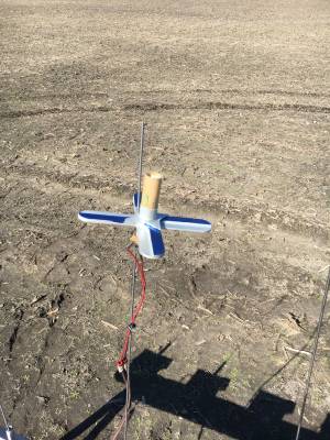 Arcing flight profile off the rod, still an entertaining low drag high spin flight. Still under thrust as the rocket arced over and headed downhill. Landed on the field, ejection charge fired after the rocket was on the ground, no damage.