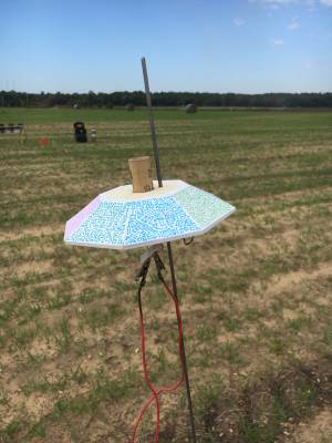A little saucer action to start off the day. Winds were negligible. Great boost, nice and straight, towing a big low pressure cloud of smoke behind it. Flipped over at apogee and settled slowly back down to the field. Perfect.
