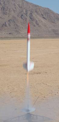 First Flight!  Nice boost, fast and high.  Arcing over at the top of the climb, still nose up at ejection.  Lost sight of it on the way down, easily spotted a short distance away after landing.  No damage, looked like the payload section went through a few of the shroud lines.