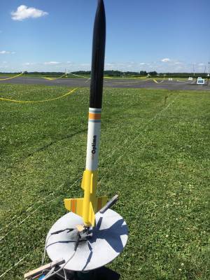 Nice straight Flight, little bit of a tail wiggle under thrust. Arcing into the wind during the coast, still nose up at ejection. Good chute, short walk, grass landing, no damage.