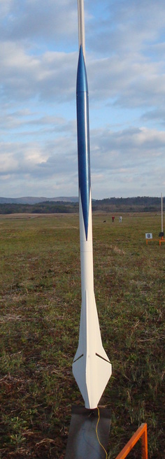 Great Flight on a CTI Blue Streak motor. Beautiful boost, fast straight and high on a pretty blue flame. Arcing into the wind during the coast. Good drogue deploy at apogee, good main deploy at 500 feet. Long walk, muddy landing, no damage