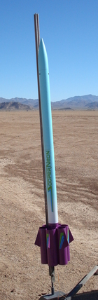 Another great flight! Screamed off the pad, straight and true. Arcing over, good drogue at apogee. Moving quite a bit on the way down. Good main chute at 500 ft. Landed on the lakebed, no damage.