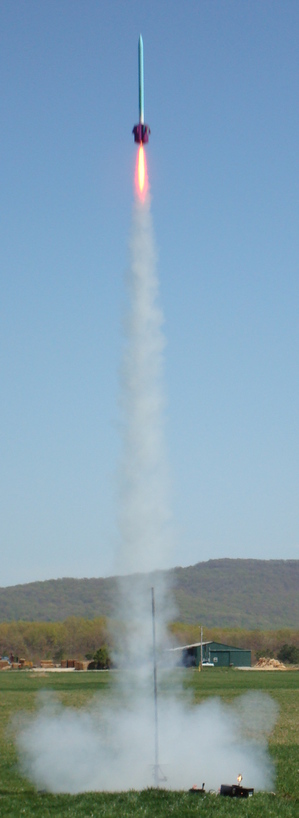 New packing job for the main chute. Great boost, very quick off the rail. Slowed down fast after burnout. Drogue charge at apogee also separated the avioncs bay from the payload section, pulling the main deployment charge out of the bay but not the main chute. Main charge even fired on time at 500'. Grass landing under drogue, no damage. Still needs another flight to see if the deployment scheme is right.