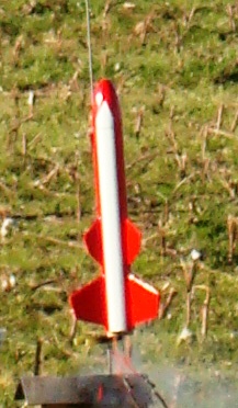 Last flight of the day, another rocket from the "doesn't get flown much" box.  Someone had put out a long 1/8" rod on the launch rack so I decided to fly the Hank, even though the winds were pretty strong.  Both motors lit right up using Quest Q2G2 igniters and the flight was straight and fast, arcing over into the wind at the top of the climb.  Still climbing a bit at ejection, chute got tangled around the aft end of the rocket and never inflated.  Rocket landed more or less flat on the dirt access road and then barely escpaed being run over by one of the big manure spreaders working in the field.  No damage.
