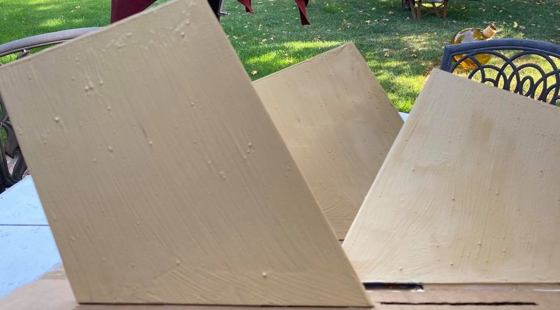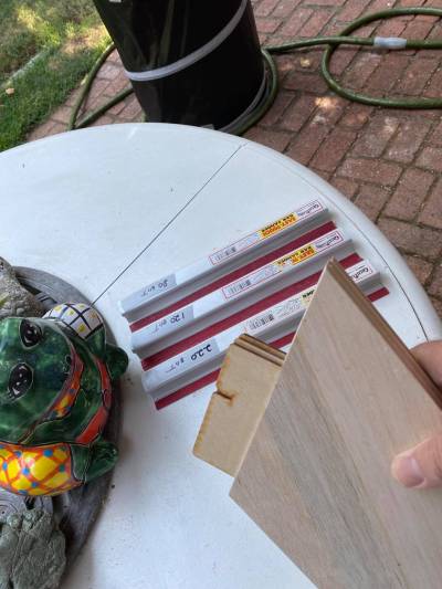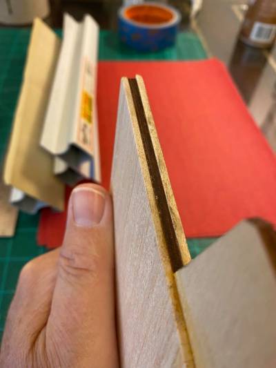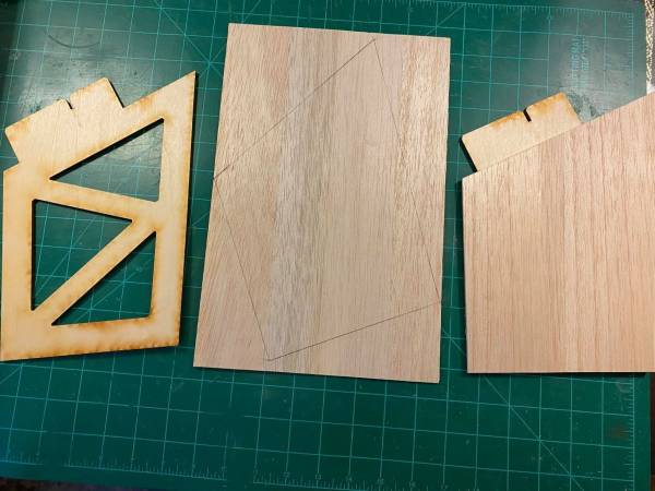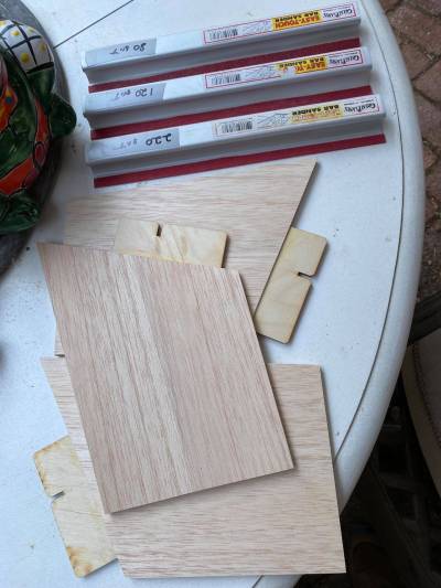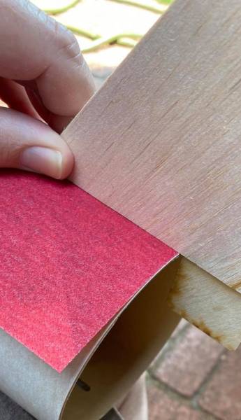You get twelve sheets of wood and must attach two length wise, so at the end you have six sheets of wood to cover your three fins (one sheet per side). I just used Titebond II and pressed them together for a bit. Now I have them stacked under some flat books overnight.