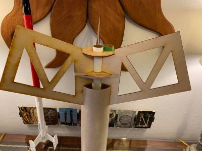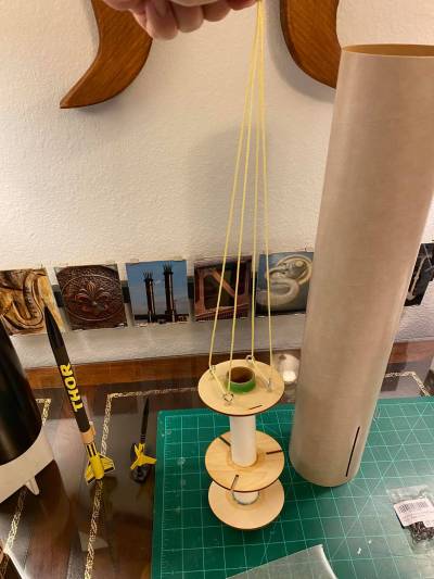 I’ve already attached the bottom centering ring (top of images), which was spaced using the green spacer ring, in the image to the left. I’ve created a rig (which flipped everything upside down to gain the aid of gravity) to properly space the middle centering ring. You may need squint to see the two long rubber and safety pin looped through the fins to provide tension and holding everything in place. I’ve tacked the bottom (previously) and middle centering ring with 5-minute epoxy. After it’s set, I’ll do the upper centering ring which is also spaced and held in place by the green spacer ring. to permanently attach the centering rings I'll use Fix-It epoxy which is like iron when it dries. I plan on flying up to H engines in this bird.