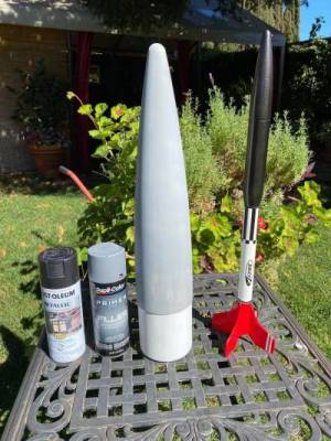To try and avoid paint winkles on such a big nose cone I sanded the nosecone with 220 grit sandpaper, sanded down the mold seam and wiped it down after sanding. That should clean out any mold release and prepare the nose cone for primer. I primed the nosecone and sanded it with 400 grit sandpaper till I could see the plastic underneath. Now for the paint…