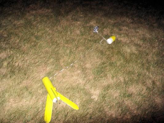 Very long flight. Arced towards west. Parachute deployed, but did not open. Rocket drifted east and landed about 100 yards southeast of launch site. Daniel recovered. Fin loose on impact; will need to fix before next launch. Parachute ruined and will need to be replaced before next launch.