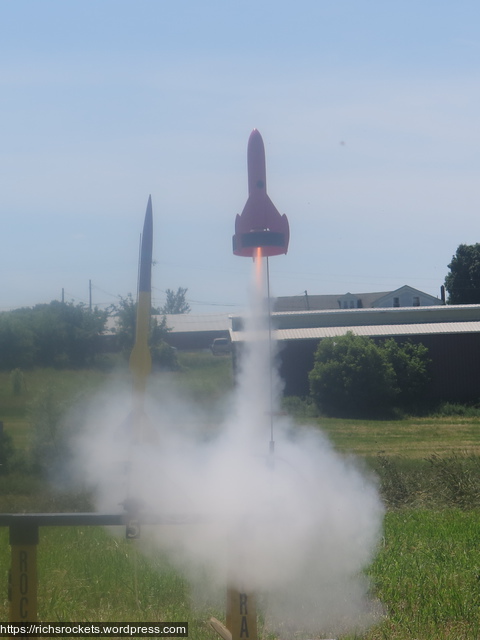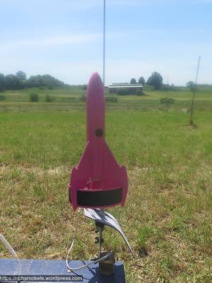 By that point it was early afternoon and the paint was suitably dry and non tacky on the Mega Sprite. I had to borrow a D/E adapter since the orange thing in my case turned out on close inspection to be, uh, something else? and I didn't feel like sticking in an E9 on the first flight. I used a D12-3 instead. Nominally 3, and maybe it was, but ejection seemed worryingly late. It did eject, but the chute (a nylon Top Flight, as usual) for some reason didn't inflate. Instead it did a streamer imitation all the way down... or an imitation of a chute with a stripped shroud. Anyway, no harm done to the rocket, and on inspection the chute was perfectly fine. I have no idea why it malfunctioned. Aside from that the flight was pretty good, but it'd probably prefer an E motor.