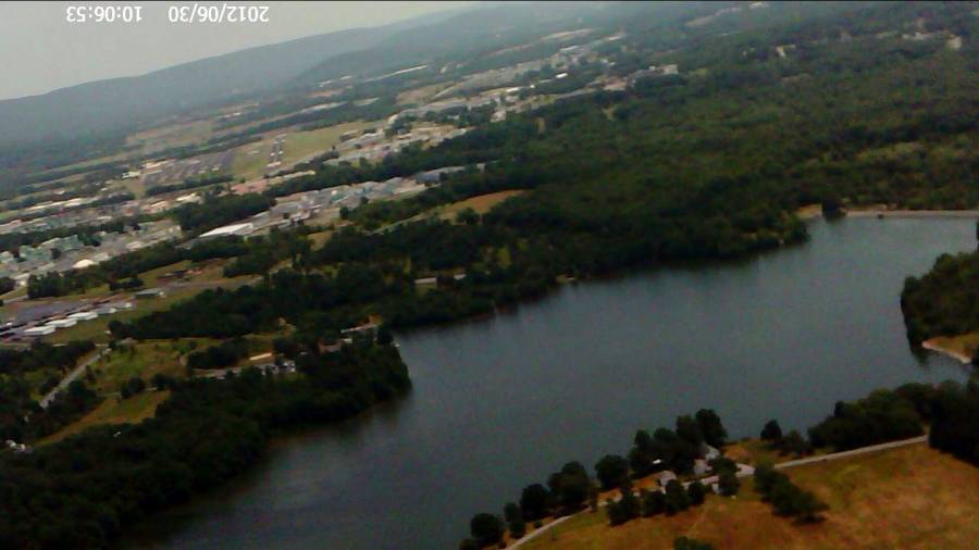 This aerial photo shows Memorial Lake in Fort Indiantown Gap, PA. This was taken from just under 800 feet altitude using the Bandit HD rocket.Further into the distance to the East, the runway of the US Army base can be seen, about 2-1/2 miles away. The camera records the date and time which is shown upside-down on the upper left of the screen. This is because the camera is oriented upside-down as the payload is descending under three parachutes.