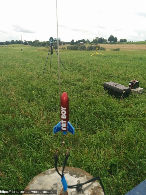 In honor of James Shattell's Level 3 attempt with the Extremely Fat Boy (one of those not paying off efforts) I led off with the Micro Fat Boy on its first flight. James's was the largest rocket ever flown on our field; mine, probably, was the smallest. I asked for lots of eyes on this MMX model, the grass being what it was. Turns out I did see it land but that was about all I saw of the flight. The orange streamer crammed inside the nose cone helped visibility both on the descent and on the ground.