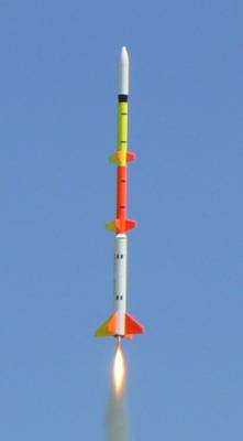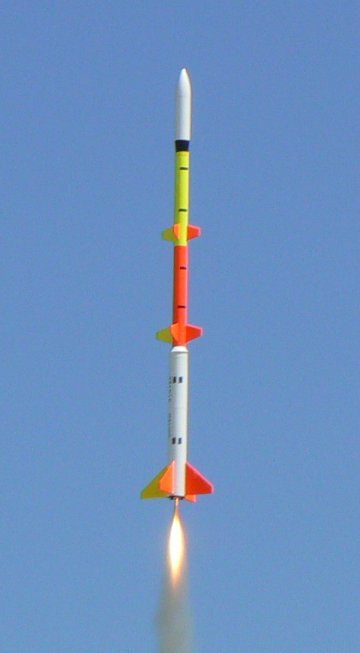 Used small BP charge to separate stages; worked perfectly, as did both deployments. (Extra detail added for NAR Sport Scale competition.)