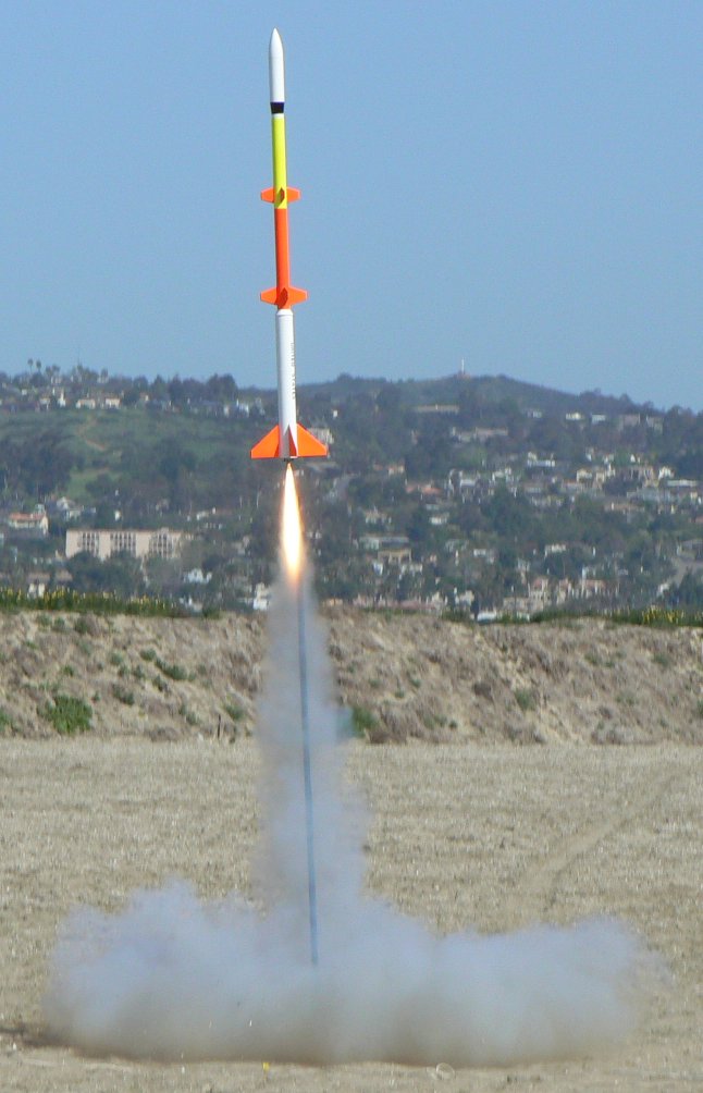 Staging test using dummy upper stage motor and BP charge to separate stages. Failed to fire because Raven altimeter settings were slightly off; everything else worked well.