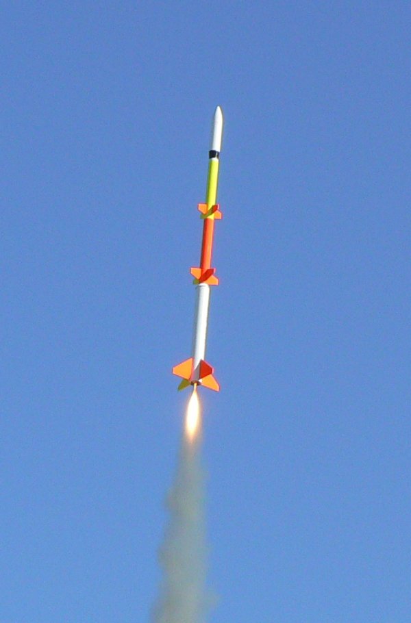 Booster-only two-stage test. Altimeter deployed second-stage main at apogee but chute lodged in tube. First-stage motor ejection very late; deployed 20 feet AGL. Fin damage to both stages; repairable.
