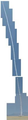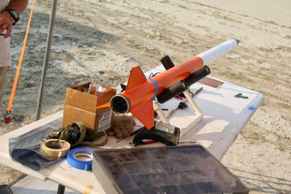 Rocket developed a wiggle during boost and broke at the coupler about 5 seconds after liftoff. The payload section in pieces was recovered about 0.5 miles out; the booster came in ballistic and stuck into the playa about 1.7 miles out.