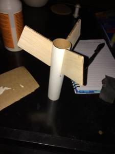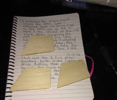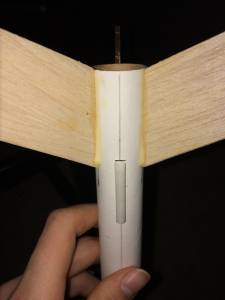 I cut out the 3 fins after sanding both sides lightly. After cutting those out I sanded the root edges to make them all the same. I then rounded the edges opposite of the root edge. Before gluing the fins on the body tube I put glue on a piece of cardboard and let it dry until it became tacky making it so I won’t have to hold the fins in place as long. After attaching the fins I took a toothpick and ran a line of glue along each side of each fin where the fin meets the body tube to allow the fins to have a better bond to the body tube. After attaching the fins I attached the launch lug, first I lightly sanded one side of the launch lug then applied glue and attached it to the body tube.