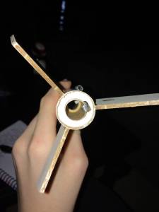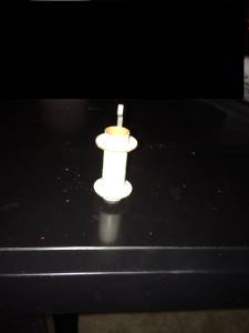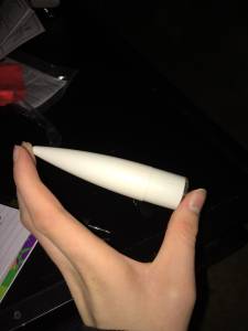 My next step was to install the MMT, which is the scary part because of previous experience. My first step was to test fit the MMT, which was successful. After test fitting then it’s time to apply the glue and insert the MMT into the body tube. I made a 1” mark on a tooth pick and used this as my guide to insert the glue. I put a ring of glue 1” inside the body tube all the way around the body tube and then inserted the MMT until the end of the tube was eye level with the fins. After letting this dry for a few mins I ran a bead of glue around the rear centering ring where the centering ring meets the body tube to allow for a stronger bond. After installing the MMT inside the body tube I assembled the shock cord. First I cut out the templet that is used to glue the shock cord on, then I apply glue to the #2 spot on the paper and lay the shock cord in the glue, I then fold the end that has the # 1 on it over the #2 spot, last I apply more glue and fold the spot marked with the #3 over the #1 and #2 spot and hold until dry. After this is done its time to install the shock cord in the body tube. This step was almost disastrous. I didn’t glue the cord far enough down which made it so the nose cone would not go all the way on. The instructions say to glue 1” down from the top of the body tube and I didn’t go quite far enough. I let the glue dry and then my wonderful fiancé (who got me into building rocketsJ) saved the day. He tore the cord out and used epoxy clay to re attach it. Now we let it dry for 24 hours.