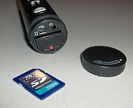 Here are pictures of both ends of the camera. In the first photo you can see the microphone located above the camera lens. The other two photos show the back end of the camera with the twist-lock cap off. You can see where the SD card and the battery tray slide into the camera. Also visible on the back end are the USB 1.1 and A/V jacks matching the cables come with the camera. When the camera is plugged into a live USB port, it draws power from the port instead of the batteries. The camera's internal or add-in memory (but not both at once) are then accessible by your computer as a removable drive assuming you have already loaded the included software. (More on this below.) The A/V cable lets you connect the camera directly to a TV or VCR so you can play back your recorded images. In this mode, the Menu and Enter buttons control on screen VCR-like buttons.