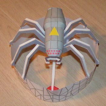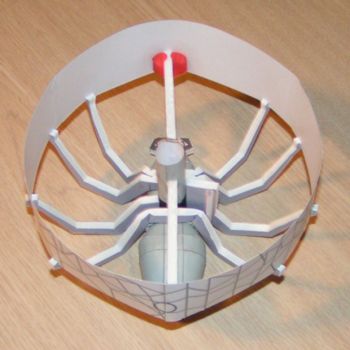 The motor tube is placed into Spider body perpendicular to it. Then six legs (three pieces) are attached to the bottom of the body. These glue onto markings on the body and are then folded to align with the outer web (ring). The outer web is made up from 3 pieces of cardstock that are glued together to form a ring.