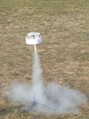 FlightThe third opportunity, simply required me to insert an ignitor and place it on the pad. I did just so. After a countdown the Flying Spider flew. It was excellent. Straight up and quite high for being such a large U.F.O. rocket. At apogee, the parachute popped out. The rocket inverted and the parachute kind of dangled out one side. I suppose helping to slow it down.
