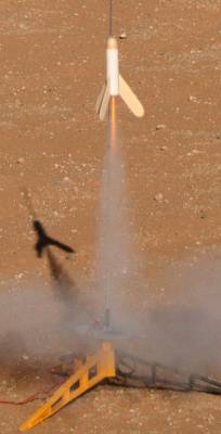 First flight of my nekkid Mosquito 50...nice straight boost...kicked motor and of course became stable on the way down. Hit the desert floor hard and banged up the body tube a bit. Popped all three fins.