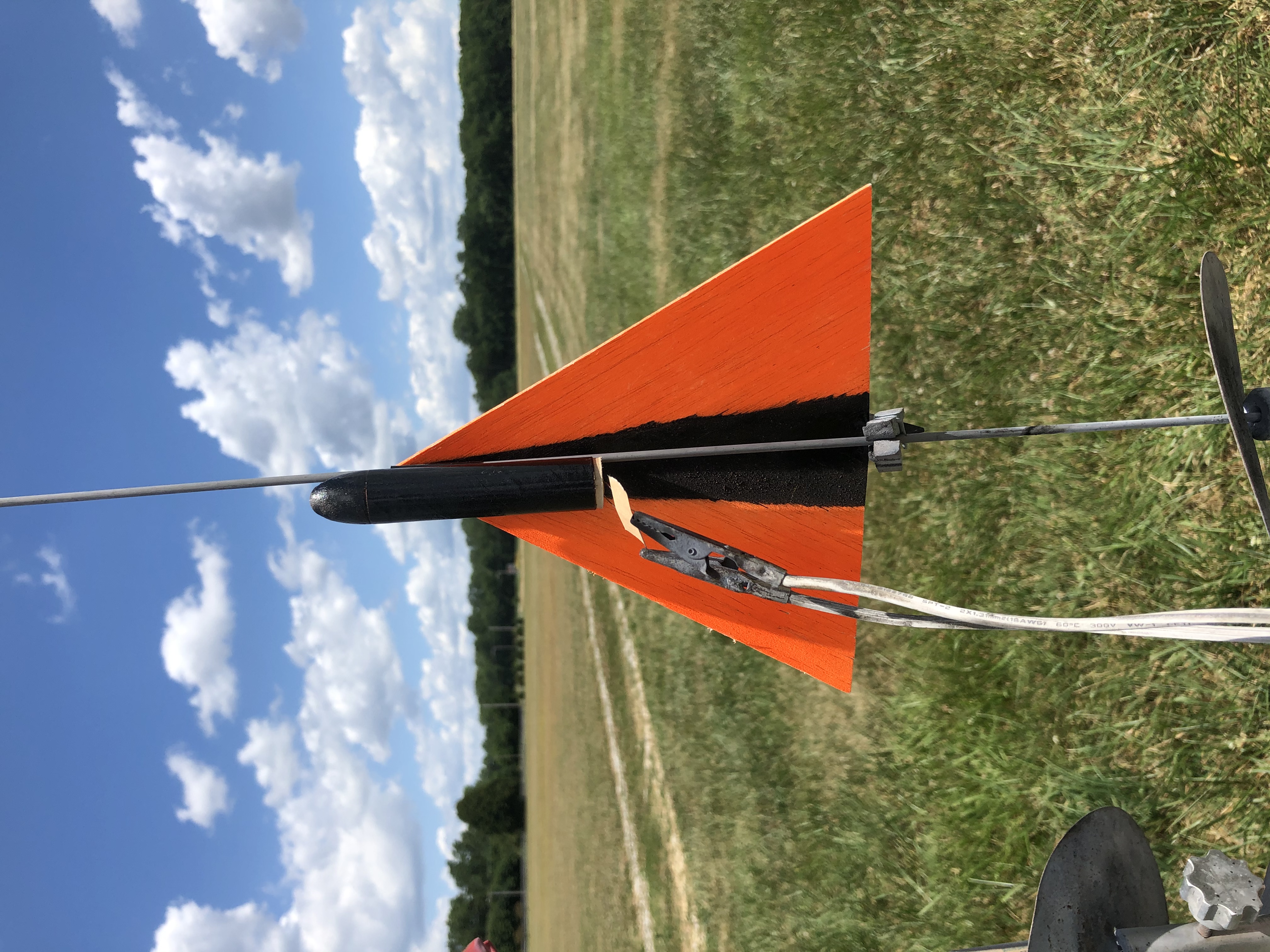 Impressive altitude with a windcock to the left. Fluttered rather than glided after ejection. Ejection charge broke the pod away from the glider and was lost. Glider body recovered out near the soccer goals.