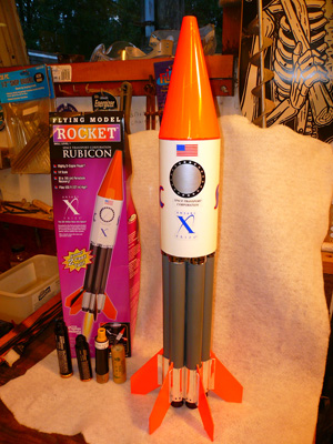 Monocoat and Other Adhesive FilmsI have been experimenting with various films. Monocoat which is used mostly in the RC aircraft world for skin of wings and such adheres to cardboard and plastic really well and add sheer strength too. Monocoat comes in a whole bunch of colors and runs about 15 bucks a roll. One roll is enough to cover a lot of mid power rockets. Self adhesive films are also fairly easy to work with and give good finish results. I have built a number of boost rockets and boost gliders and use the shiny chrome on the bottoms of the wings with very little weight gain. $3 bucks for a 6x36" strip. I've attached an example of the results. The fins, couplers, upper airframe and nose cone were covered with film.