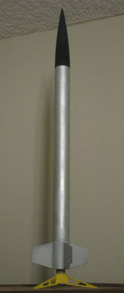 After a bit of spot putty to cover the spirals, the body got a few coats of silver to match the fin can. The nose remained black.