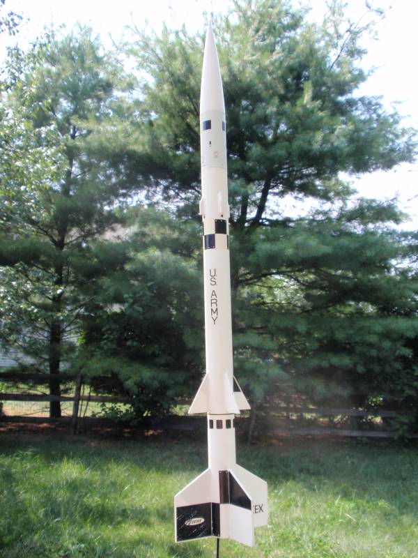 Nike-X with Iris PayloadThe complete classic Nike-X model with Iris payload added. This additional payload, a nylon parachute and nomex cloth adds 17.5 grams. The additional weight makes this model no longer safe to fly with an A8 motor. Built in 1977. |