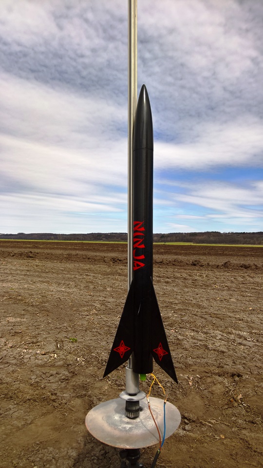 I recently built this upscale of the Estes 0882 Ninja, of which I had an original in the late '80s (now MIA). This one is upscaled to use BT-70 tube, so its just about 3X the size of the original. This has a 29mm mount, simple black paint and decals from Stickershock23.