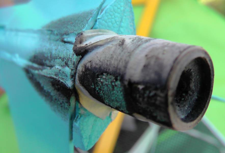 Not only did the tape burn here, but it left a sticky residue that needed to be sanded off the body tube finish, making this model a bit uglier.  Note also the balsa of the lower fin is burned, it is not just surface soot.  That is not good.  I recommend you don't use tape externally here except to friction fit the end of the motor tube to the booster stage's manifold.  Use tape on the motor tube to friction fit the motor internally.  I will also spray the inside, lower portion of each upper stage with a high-temperature metalic paint in hopes of preventing future burns.