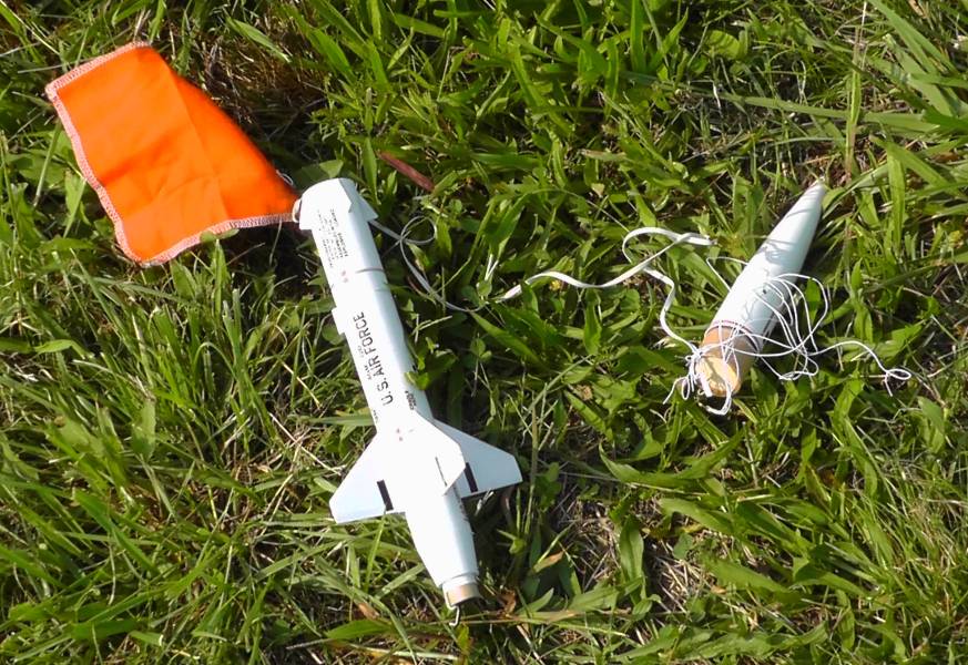 A: still floating down. A result of a heavy rocket, Estes recommendation to use a -5 (I should have known better and tried a -3), and an Estes motor with a delay that burned for a second too long. The orange thing is a Kevlar parachute protector, but had to function as a streamer for this particular flight.