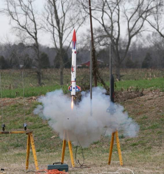 Notice the Cap coming off the Engine that has fired, the other engine will lite also but at this point the rocket is half way up the rod with the clip on and no fire. but it does lite!
