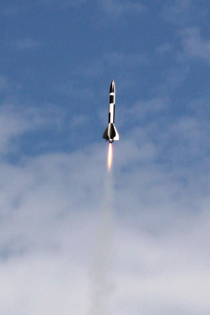 The model itself is 27.5" long, somewhat stubby, with a length ratio of about 12:1, has a 3G ogive balsa cone, neat boat tail and Six delta fins that are clipped in a slightly raked manner. Building with six fins is a little more challenging, but looks really cool, especially wrapped over the boat tail. The rocket is designed to fly on E20, E30, F32, or F44 motors. A 24mm motor mount was used to maximize the taper of the boat tail. I am now deciding on how to paint it, likely going with a black & white roll pattern.