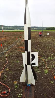The model itself is 27.5" long, somewhat stubby, with a length ratio of about 12:1, has a 3G ogive balsa cone, neat boat tail and Six delta fins that are clipped in a slightly raked manner. Building with six fins is a little more challenging, but looks really cool, especially wrapped over the boat tail. The rocket is designed to fly on E20, E30, F32, or F44 motors. A 24mm motor mount was used to maximize the taper of the boat tail. I am now deciding on how to paint it, likely going with a black & white roll pattern.