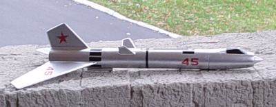 Since I had used basswood for the fins, finishing looked like it was going to be a breeze. Following a coat of thinned Elmer's Fill n Finish (and the sanding thereof,) and a couple of coats of primer (ditto sanding,) I sprayed on the initial coat of Krylon Metallic Silver. The metallic paints coat evenly and quite well, but when dry they tend to accentuate any inconsistencies in the rocket's surface, (at least in my experience.) The body and fins looked fine, but the area immediately surrounding the fins looked particularly sloppy, bad enough that even a full set of decals weren't going to distract even casual onlookers from the sub-standard sanding job. At this point I decided to take a mulligan and do a combination re-sand of the areas around the fins and a color sand of the first coat. This made for a marked improvement. A set of inkjet decals completed the "catalog perfect" look.