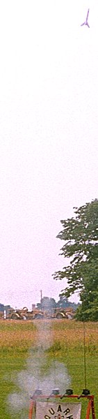 This was one area where I was surprised to find that improvement was needed, although I suspect that the fault lies with the builder, not the design. I first launched the Wolverine at a QUARK section launch in the spring of 2002. For the first flight I deliberately chose an engine that was on the conservative side, a 1/2A3-2T, hoping to get a better idea of the rocket's flight characteristics. Unfortunately the most notable flight characteristic turned out to be a habit of wobbling as it left the pad. Ejection occurred at apogee and overall it was a good flight, but the wiggle had me worried. "More power," I mistakenly thought, and plugged in the "mighty" A10-3T for the second flight. This made the wiggle disappear entirely, but the wobbling, end over end flight pattern that replaced it wasn't the fix I had been hoping for. This made me rethink the problem and I figured that substituting basswood for balsa had probably messed up the rocket's surprisingly delicate balance. Several of my fellow QUARKer's also came up with this theory, so I felt like I was moving in the right direction. The third flight came after I had added some nose weight in the form of two good sized screws into the bottom of the nose cone next to the screw eye. The resulting flight was perfect, arrow straight with a textbook recovery, not much in the area of altitude, but being a mini-brute, the Wolverine wasn't meant to be a high flier anyway. (But an UPSCALE might be! Where'd I put my crayons?)