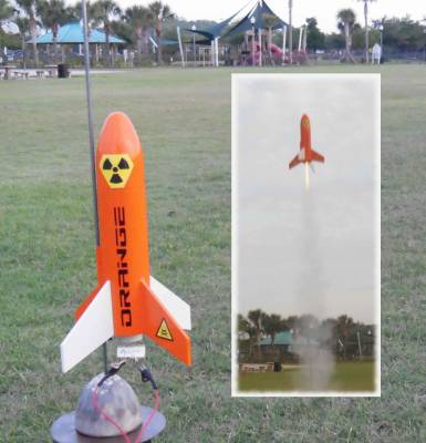 A slightly stretched ornage version of the Quest Cobalt. Built 1" longer to allow a parachute and better stability. Painted orange instead of the blue kit color.