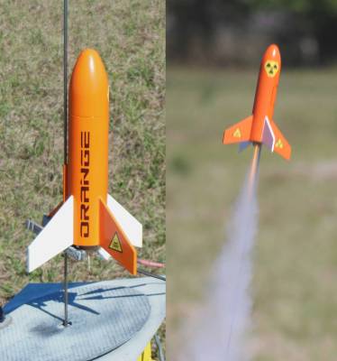 A slightly stretched ornage version of the Quest Cobalt. Built 1" longer to allow a parachute and better stability. Painted orange instead of the blue kit color.