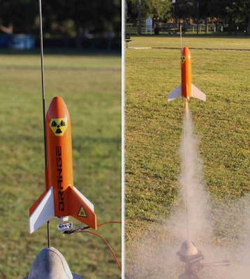 A slightly stretched ornage version of the Quest Cobalt. Built 1" longer to allow a parachute and better stability. Painted orange instead of the blue kit color.
